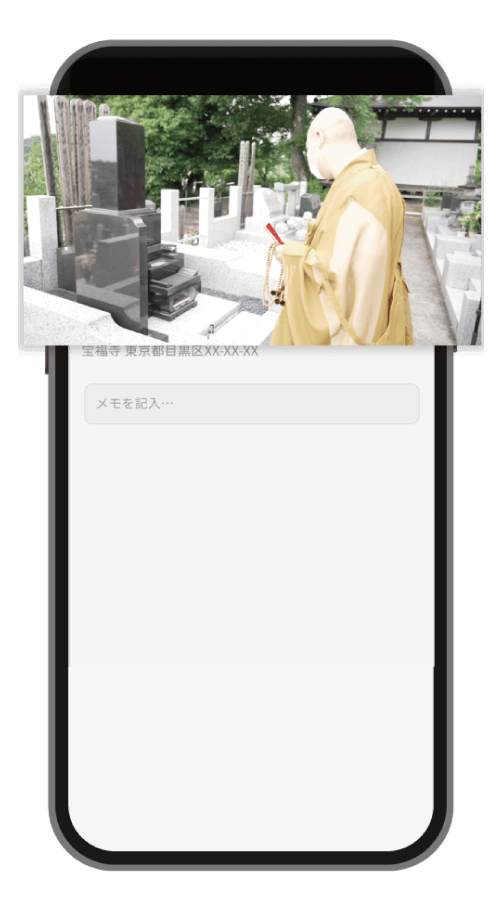 - オンライン配信前に、○○家お墓の前に三脚(推奨)を設置し、スマホをセットする。